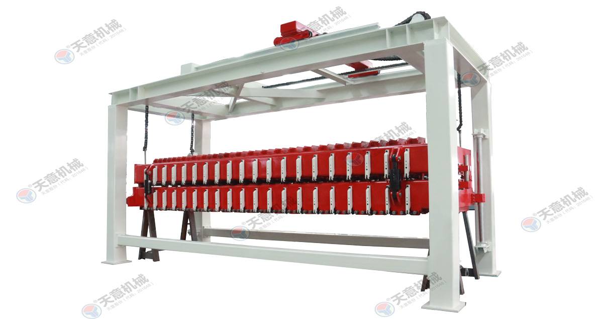 成品分垛吊機(jī):將蒸養(yǎng)車(chē)上的一模坯體吊運(yùn)至掰板輸送機(jī)上,然后將空側(cè)板吊運(yùn)至蒸養(yǎng)車(chē)上;切割工段空翻脫模機(jī)將??蚍D(zhuǎn)90°,放在切割小車(chē)支座上進(jìn)行脫模,脫模后的??蚺c清理后的側(cè)模板進(jìn)行合模,合膜后的空??虮坏?..
